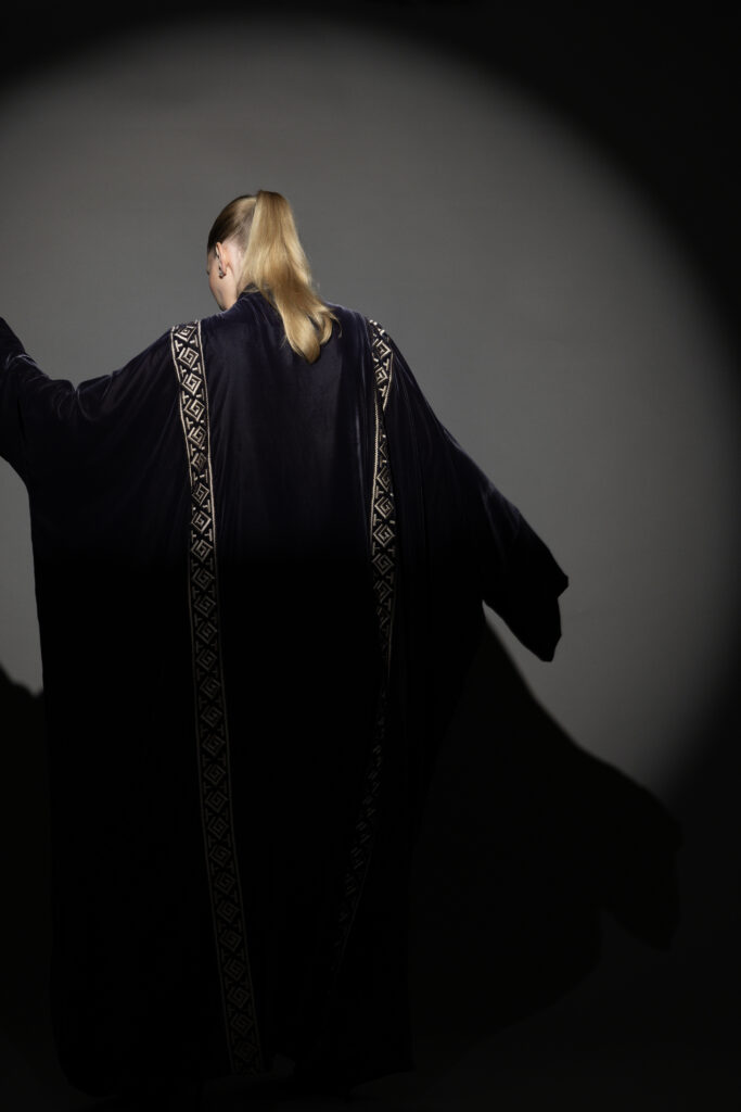 Black Silk Velvet Kaftan with Triangles Embroidery